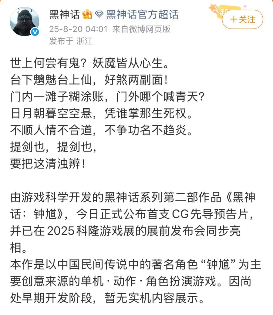 《黑神话:钟馗》首次曝光是在北京时间8月20日凌晨的科隆游戏展开幕之夜上,这一新作预告片压轴登场,迅速成为业界焦点。2023年科隆游戏展上,游戏科学团队开发的首个“国产3A大作”《黑神话:悟空》一举拿下最佳视觉大奖,成功点燃海外关注。今年游戏科学确认参展科隆时,很多玩家猜测是否会借此放出“大料”,只不过此前的猜测方向是《黑神话:悟空》的DLC(后续可下载内容),没想到等来的是一个更重磅的消息。
