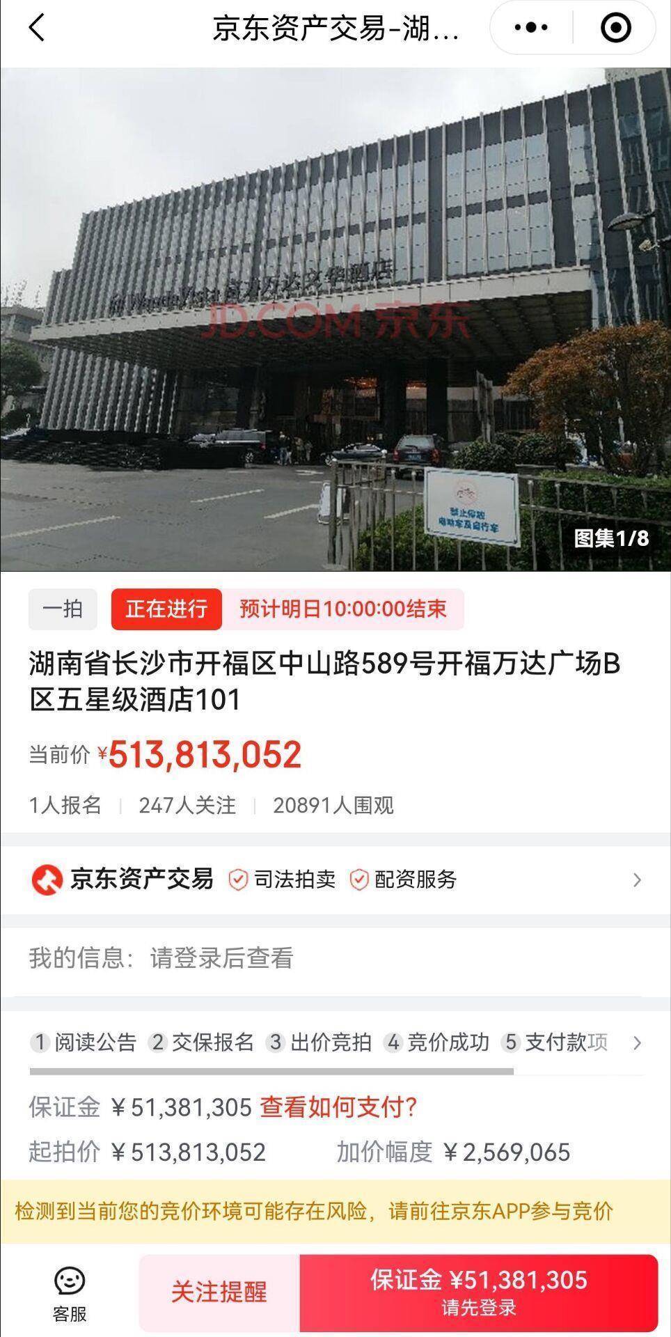 9月8日,极目新闻记者登录京东拍卖微信小程序,发现长沙富力万达文华酒店确实在进行拍卖。截至9月8日傍晚6时许,京东拍卖平台显示无人竞拍,只有1人报名竞拍,竞拍次数为零,围观人数超过2万人。