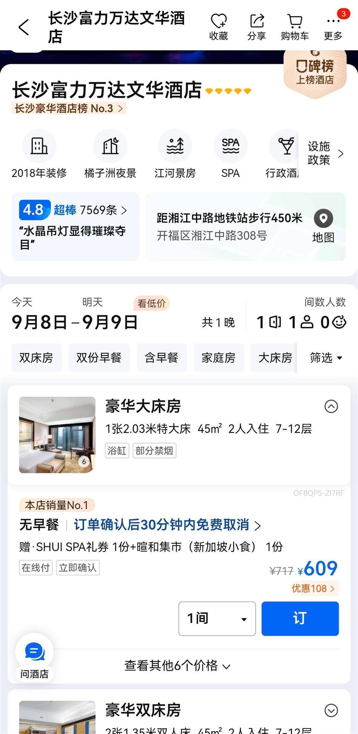 极目新闻记者注意到,当日在携程等酒店预订平台上,长沙富力万达文华酒店依然可以正常预订,9月8日傍晚酒店房间的最低预订价格为609元。