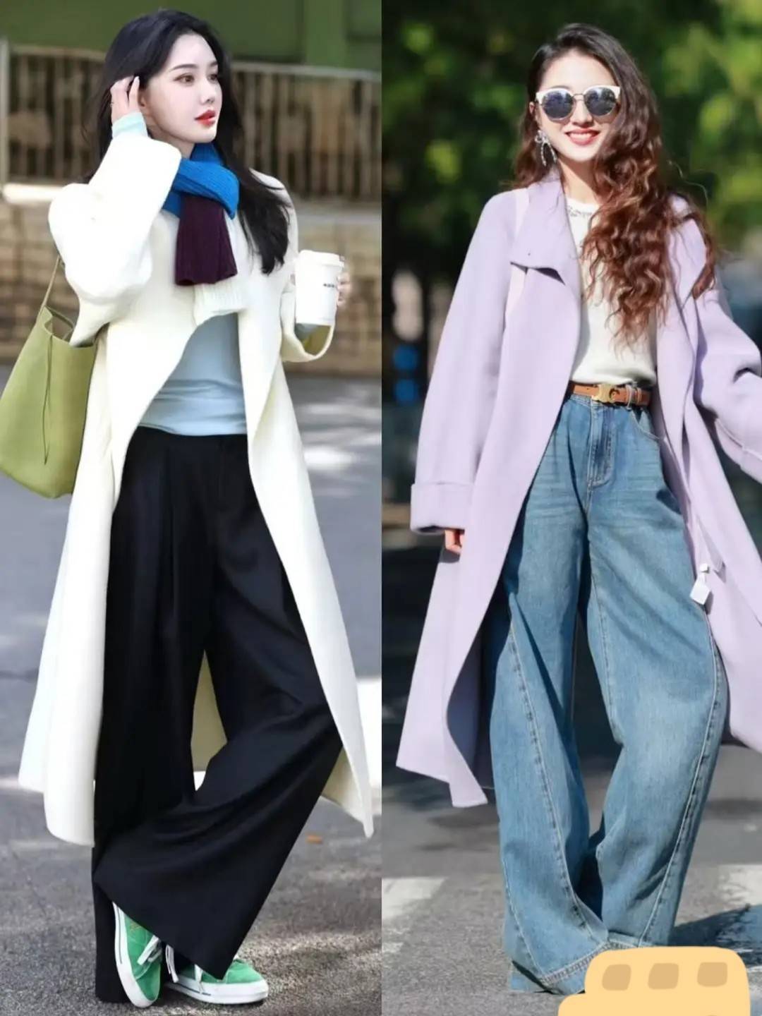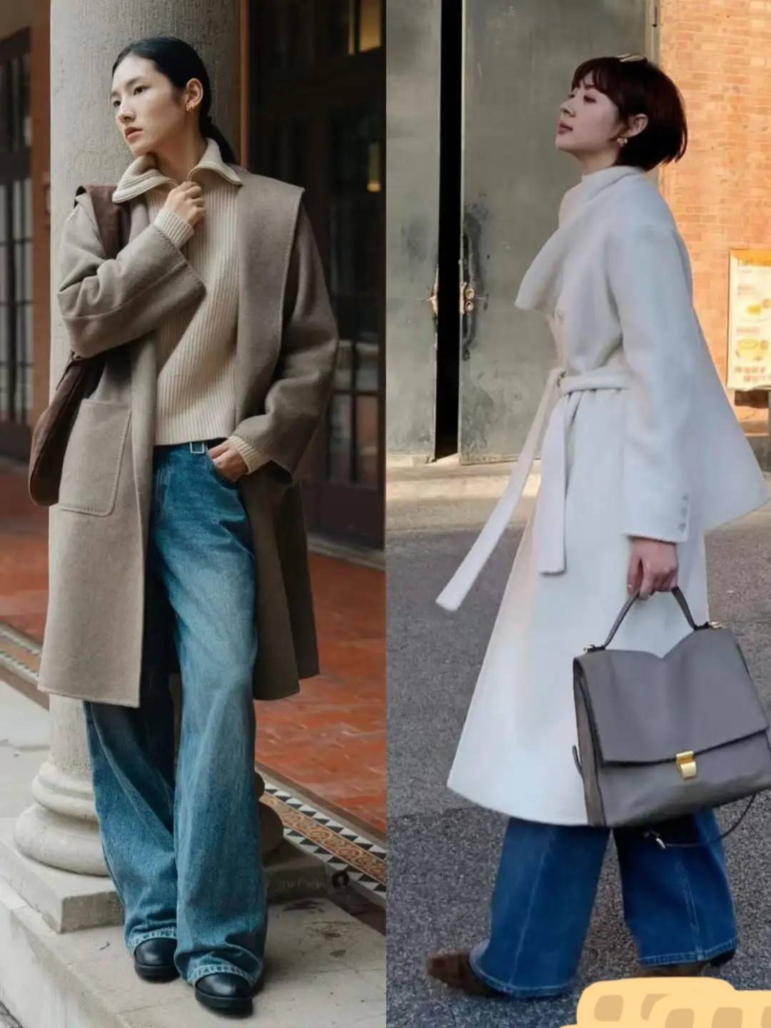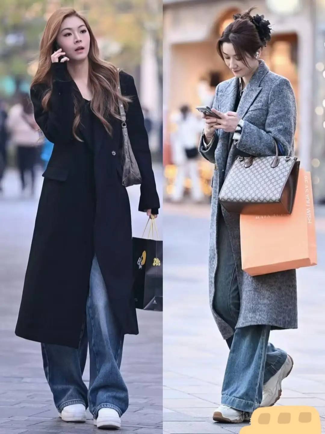 如果你的身高比较高,另当别论,例如下面左边这位达人选择的牛仔阔腿裤长度就比较长,穿在身上有那种慵懒随性的效果,再搭配上一款大衣外套,使得穿搭者很有气质感。