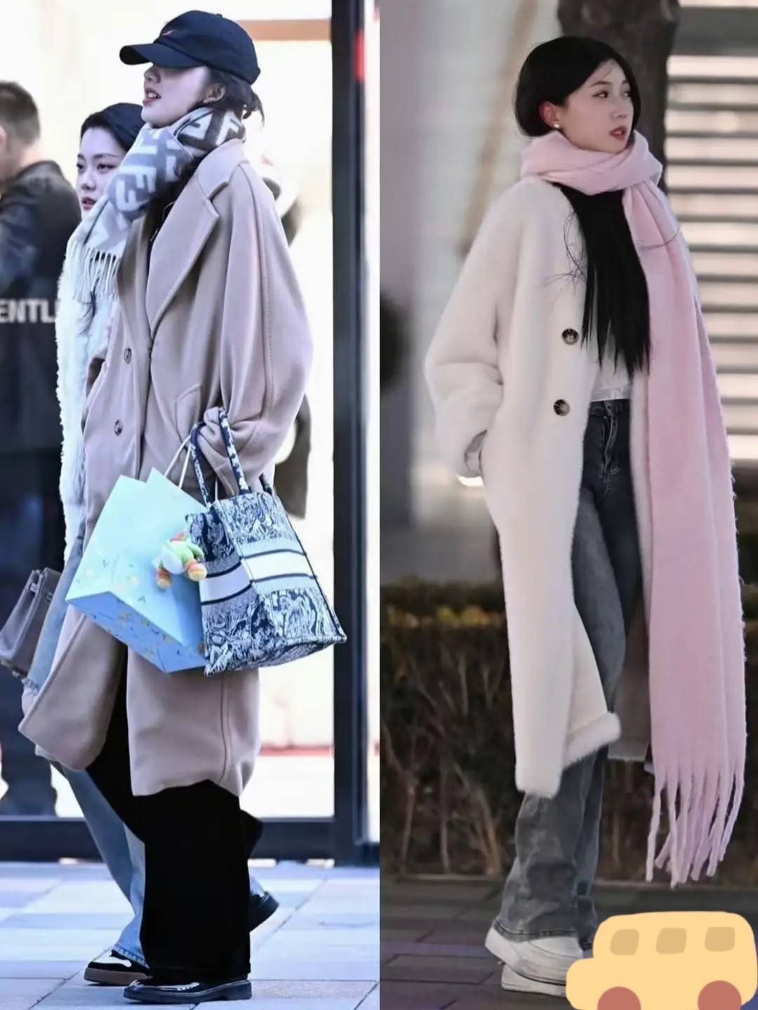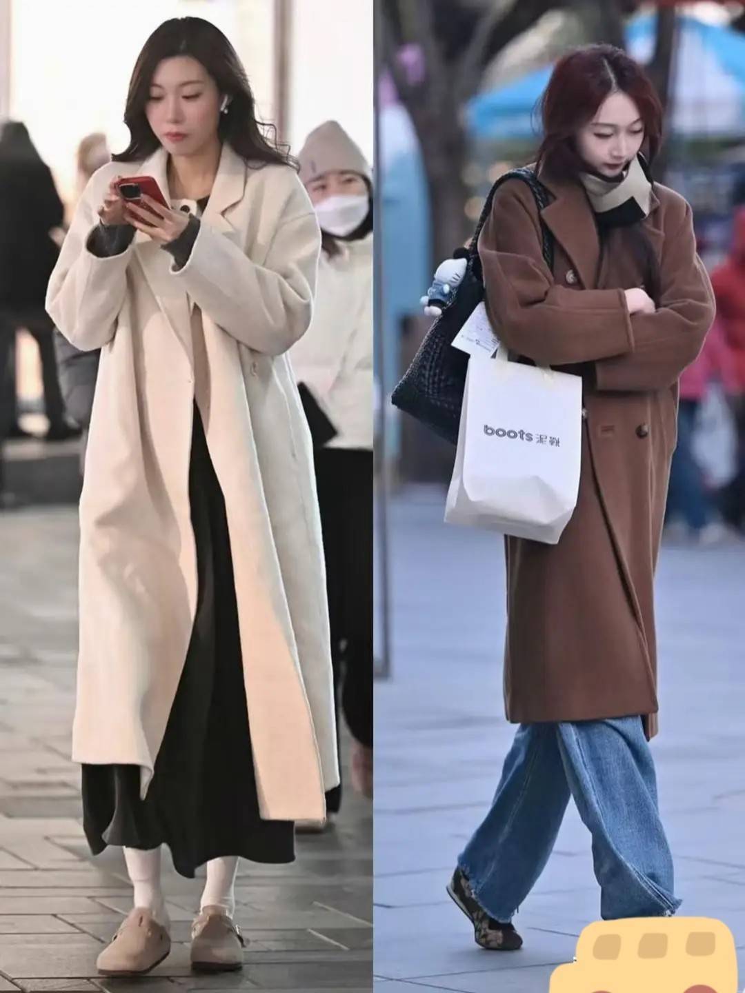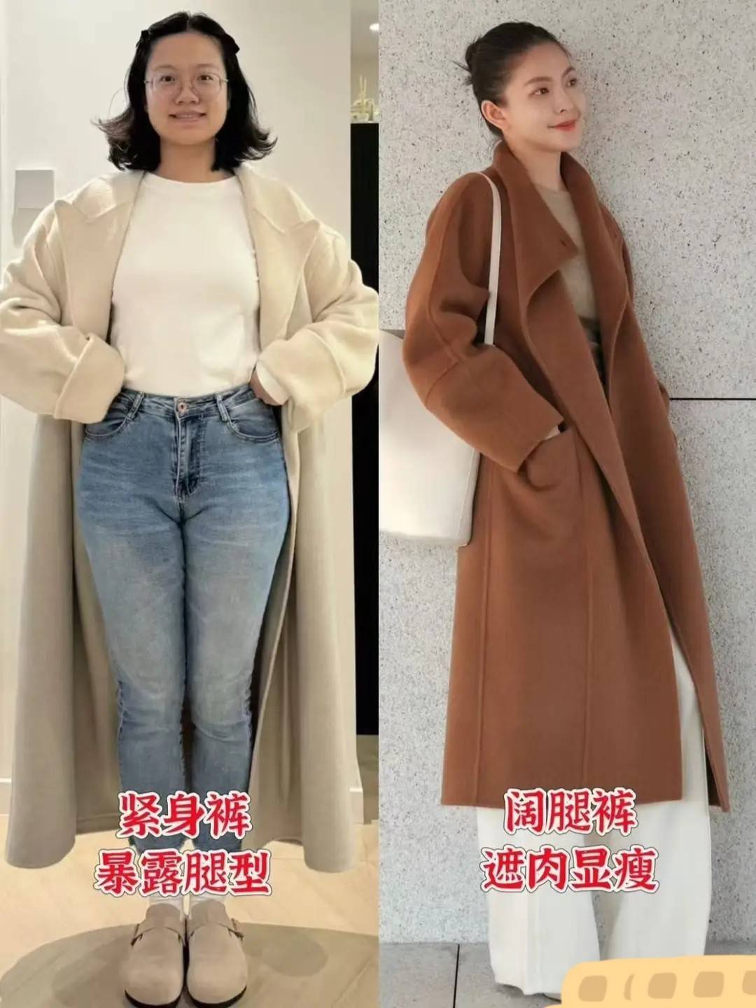 如果你的身高比较高,另当别论,例如下面左边这位达人选择的牛仔阔腿裤长度就比较长,穿在身上有那种慵懒随性的效果,再搭配上一款大衣外套,使得穿搭者很有气质感。