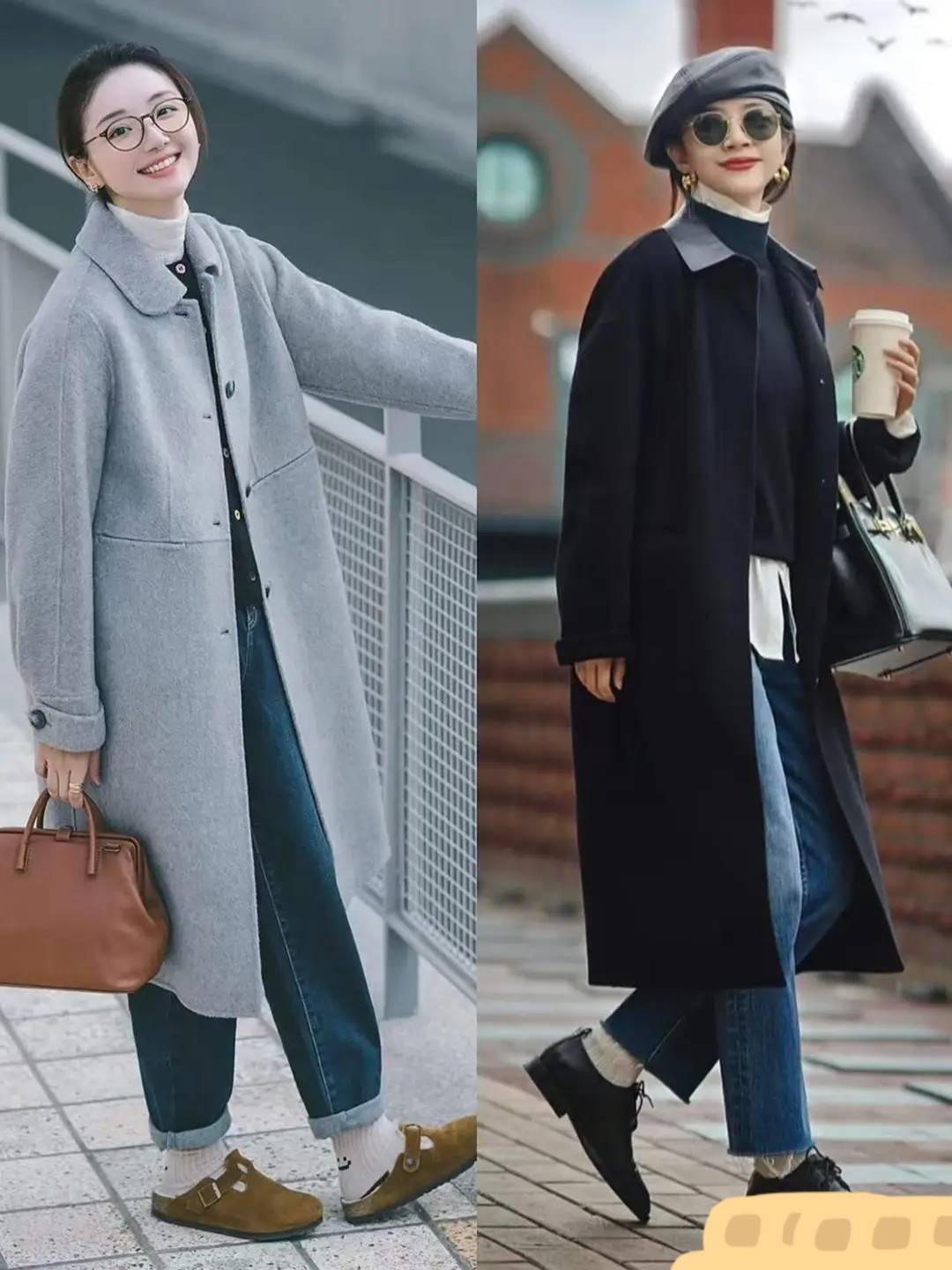 或者用灰色的大衣外套搭配上蓝色的牛仔直筒裤,脚上穿着一双老爹鞋,这样的穿衣打扮很适合职场女性。